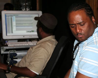 Robbo Ranx, listening to the mix in the recording booth.
