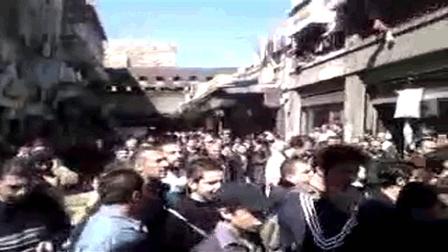 وظهر عشرات المواطنين يتظاهرون في سوق الحميدية المجاور لجامع بني امية الكبير في وسط العاصمة السورية.