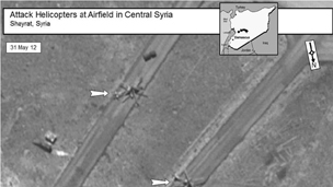 كما تظهر بعض الصور آثار قصف مدفعي قرب التجمعات المدنية في بلدة اتارب في ريف حلب، بينما تظهر اخرى مرابض للمدفعية قرب ثلاث مدن سورية وطائرات مروحية هجومية متمركزة قرب مدينتي الشعيرات وحمص.