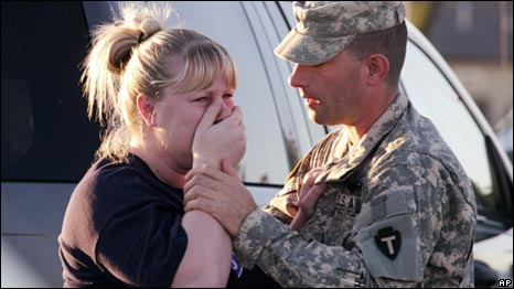 ضابط امريكي يطمئن زوجته خارج قاعدة فورت هود التي شهدت هجوما بالرصاص اودى بحياة 12 شخصا واصاب 31 اخرين