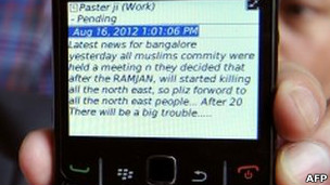 أثارت رسائل تهديد تم إرسالها بالمحمول و الإنترنت حالة ذعر تسببت في هجرة جماعية بين العمالة المهاجرة من مدن جنوب الهند القادمين في غالبيتهم من باكستان، وذلك حسب مسؤولين بالحكومة الهندية.