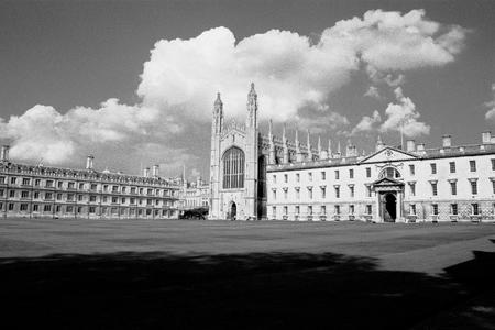 The chapel of King's College in Cambridge University dominates the picture, with the white stone of the Gibbs Building on the right, and Clare College on the left.