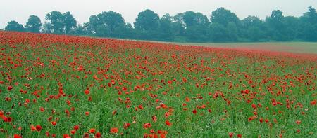 A poppy field in Surrey on a misty, hazy summer morning.