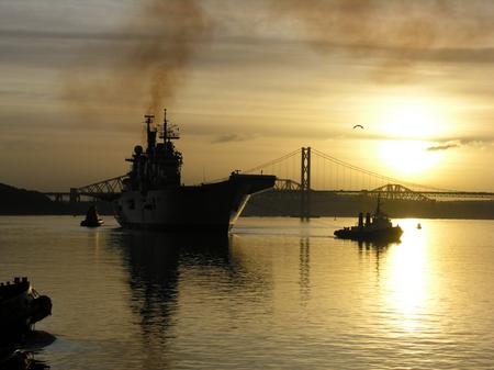 HMS Illustrious passes The Forth Road Bridge Beatiful image, yet the potential power for destruction, against the everyday background of the Forth Bridge commuting route