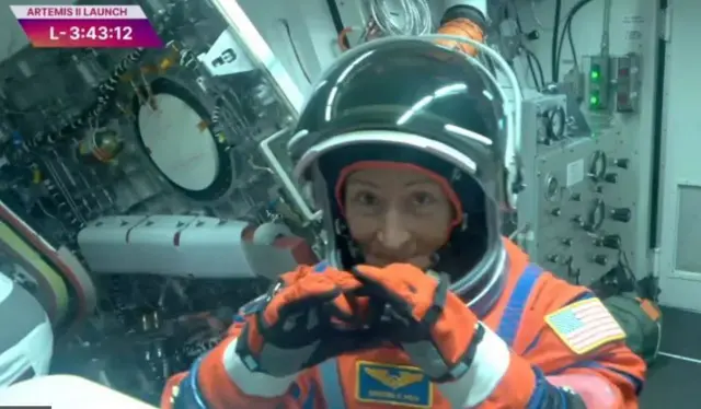 Şəklin alt yazısı, Artemis II heyəti: solda Christina Koch, arxada Victor Glover (pilot), öndə Reid Wiseman (kapitan, sağda Jeremy Hansen