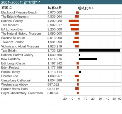 数字显示,到英国主要旅游点游览的旅客在去年7月一系列的炸弹攻击事件后明显减少。 主要旅游景点协会说,位于伦敦市中心的国家美术馆(National Gallery),去年到那里参观的游客人数为420万人次,比2004年减少了15.2%。 同样位于伦敦市中心的“伦敦眼”巨型摩天轮(London Eye)与泰特现代美术馆(Tate Modern),游客也大幅减少了12%。 不过,位于朴次茅斯的历史船塢(Portsmouth Historic Dockyard ),由于去年是特拉法加海战200周年,因此到那里参观的人增加了22.4%。 录得游客人数下降的还有伦敦塔(Tower of London,下降9.7%)、科学博物馆(Science Museum,下降7%)、大英博物馆(British Museum,下降6.8%)等。 此外,近年大受欢迎的黑池欢乐海滩(Blackpool Pleasure Beach),到来游玩的旅客也减少了3.3%至597万人次。
