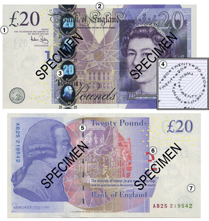 英国发行新式样的20英镑钞票,星期二(13日)开始流通。新钞票以著名苏格兰经济学家亚当•斯密的肖像为图案。 新钞票含有一系列防止伪造的加强保安措施,例如加宽的全息条(holographic strip)及微型字体。 斯密的头像钞票也是首次有苏格兰人的肖像出现在英格兰钞票上。 目前的英格兰20英镑钞票,印有英格兰作曲家爱德华•埃尔加(Edward Elgar)的头像,这款钞票将于未来几个月逐渐回收。 斯密的头像在苏格兰的50英镑钞票上已经出现了一段时间。 公众信心