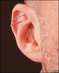 腰痛,英国人最大的毛病 英国人请病假的头号理由是什么?感冒发烧?错了,是腰痛。每三个英国成年人中,就有一个在不同阶段患不同程度的腰痛。如果按NICE的指导原则,腰痛病人都来上10-12个疗程的针灸、推拿,有人估算,可能要花费14亿英镑。 但是,另类疗法的支持者和反对者争论的焦点并不在花费上。支持者看重的,是第一次有了一个明确的、一致的指导原则,拿到了尚方宝剑;反对者则惊呼,这是为装神弄鬼、歪门邪道正名! 在继续双方的争论前,有必要提及一个新公布的实验结果。 银针与牙签同样的效果? 就在NICE公布新的指导原则的前一周,美国西雅图的健康研究中心(Centre for Health Studies)发表了它对针灸疗效的一项对比试验结果。 638名腰痛患者分成若干组。一组使用针灸,一组使用常规的西医治疗。研究者对病人在疗程的不同阶段的疗效进行检测。