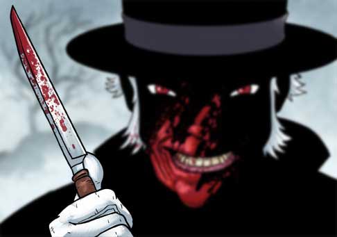 Professor Moriarty is upon him, silently, a long medical blade in his hand. He wears his opera cape. His top hat is on his head.