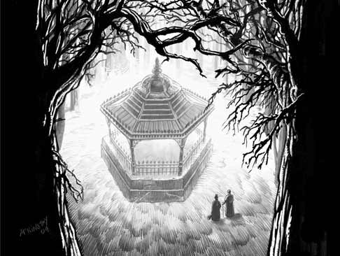 We were walking through a wilderness of winter-deadened trees, in a fog in which an entire herd of hadrosauridae could have stood shoulder to shoulder unobserved. A bandstand loomed out of the murk. Posters announced a forthcoming event involving royalty.
