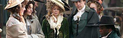Yn gweu drwy hyn mae hanes carwriaeth, betrus i ddechrau, Wilberforce a Barbara Spooner (Romola Garai).