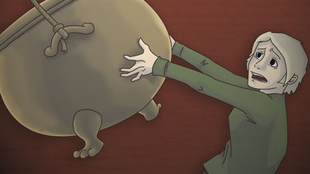 Gyda'r nos, a Pryderi heb ddychwelyd i'r llys, aeth Rhiannon i chwilio amdano. Aeth i mewn i'r castell. Dyna lle'r oedd Pryderi yn sefyll yn llonydd ar garreg farmor a'i ddwylo wedi glynu mewn cawg hardd.