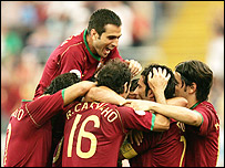 Capten Portiwgal, Luis Figo yn pasio'r bêl i Deco sy'n sgorio gyda tharan o ergyd o 20 llath.