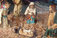 Yna, mae yna gôr o angylion yn dod i ganu iddyn nhw ar y meysydd, gan ddweud wrthyn nhw am fynd i weld y baban bach sydd wedi ei rwymo mewn cadachau a'i osod i orwedd mewn preseb.