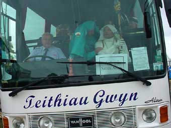 Aelodau o'r Orsedd yn gadael y maes am Neuadd PJ Bangor ar gyfer eu seremoni fore Llun am ei bod yn rhy wlyb i'w chynnal o fewn y cylch plastig newydd.