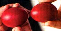 Bydd yr wyau coch yn cael eu malu mewn rhyw fath o gystadleuaeth gydag un yn erbyn y llall yn eu dal mewn dwrn caeedig a'r sawl sydd ag wy heb dorri yn fuddugol.