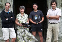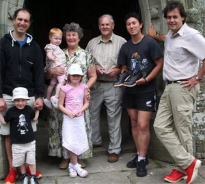 O'r tri myfyriwr cyntaf a ddaeth ar y cwrs yn 1993, Gabriel Restucha, Siôn Carlos Davies a Daniel Escobar, mae'r ddau gyntaf yn awr yn athrawon Cymraeg yn yr ardal. Mae'r cynllun hwn yn awr dan nawdd y Cyngor Prydeinig, y Cynulliad a Chymdeithas Cymru Ariannin. Gan fod chwe myfyriwr o Batagonia yma yn awr ar Gynllun Y Cyngor Prydeinig, a newydd orffen y Cwrs Cymraeg yn Llanbedr pont Steffan, daeth tri o'r myfyrwyr i gwrdd â Jean a Huw gan dderbyn y clocsiau ar ran y dawnswyr draw ym Mhatagonia. Hen gysylltiad Dewiswyd Llangynwyd ger Maesteg ar gyfer hyn oherwydd y cysylltiadau lleol â Phatagonia ac am fod grwpiau dawnsio gwerin yn yr ardal. Cyd-ddigwyddiad unigryw yw'r ffaith bod un o'r myfyrwyr, Luis Chavarria Owen, yn hanu o deulu Guilford o ardal Penyfai a Llangynwyd, a ymfudodd i Batagonia yn yr 1870au a thynnwyd lluniau o flaen drws eglwys hynafol Llangynwyd. Wrth gwrs, bydd yn rhaid i'r cystadleuwyr clocsio aros am ychydig bach cyn cael eu ddefnyddio gan na allai'r tri myfyriwr eu cludo drosodd a phan gyrhaeddant bydd yn rhaid rhannu'r clocsiau rhwng y cystadleuwyr nes y bydd digon ar gael ar gyfer pawb. Yn y lluniau: Llun cyntaf: Jorge Leccese (Gaiman), Luis Chavarria Owen (Comodoro Rivadavia), Juan Alberto Davies (Trelew) a Jean Huw Jones. Yr ail lun: Jean Huw Jones a gyflwynodd gopi arall o'r fideo Dysgu Clocsio i Luis gan nad oes copi o'r fideo gyda nhw yn ngrŵp Comodoro Rivadavia. Jorge, Juan, Luis, Jean a'i hwyres.