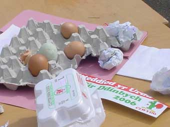 Un o ddigWYddiadau cyhoeddi Eisteddfod yr Urdd Sir Ddinbych oedd ras wy a llwy - dyma luniau o'r digWYddiad