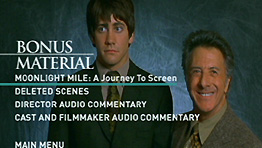Skip the yucky documentary and head instead for the two audio commentaries. The first is an informative solo effort by Silberling, where he talks us through the last four years of his life. More entertaining, though, is Silberling with Dustin Hoffman and Jake Gyllenhaal, who all end up having a highly amusing natter. Hoffman is a funny guy, gets interesting information out of the other two, and warns Gyllenhaal that all the fans he saw hanging around the set will be the same ones he'll see decades later, just as he retains the same fans from his Graduate days.