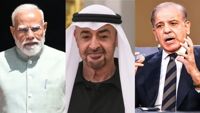 इमेज कैप्शन, भारत के प्रधानमंत्री नरेंद्र मोदी, यूएई के राष्ट्रपति शेख़ मोहम्मद बिन ज़ाएद अल नाह्यान और पाकिस्तान के प्रधानमंत्री शहबाज़ शरीफ़