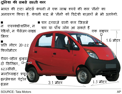 सोसाइटी ऑफ़ इंडियन ऑटोमोबाइल्स के दिलीप चिनॉय कहते हैं, "भारत में लोगों की आय बढ़ रही है, अर्थव्यवस्था नौ फ़ीसदी की दर से बढ़ रही है, ऐसे में बहुत बड़ी तादाद में ऐसे लोग हैं जिनका कार ख़रीदने का सपना अब पूरा हो सकता है." आर्थिक शोध से जुड़ी संस्था क्रिसिल का कहना है कि "एक लाख रूपए में कार उपलब्ध होने की वजह से कार ख़रीदने सकने वाले लोगों की संख्या में अचानक 65 प्रतिशत की वृद्धि हो गई है और छोटी कारों का एक नया बाज़ार खुल गया है." रतन टाटा ने नैनो के प्रोटोटाइप का अनावरण करते हुए कहा था कि यह कार लोगों को मोटरसाइकिल के मुक़ाबले अधिक सुरक्षा प्रदान करेगी और पूरा परिवार सुरक्षित यात्रा कर सकेगा. ऑटोएक्सपो में आए एक मेडिकल रिप्रेज़ेंटेटिव अक्षय मित्रा ने कहा, "मैं मजबूरी में अपने परिवार के साथ मोटर साइकिल पर चलता था, मैं जानता हूँ कि यह सुरक्षित नहीं है, कार ज़रूर सुरक्षित होगी." कार डीलरों का कहना है कि अभी से लोग पूछने लगे हैं कि कार कब तक बाज़ार में आएगी, लोग इसे एडवांस में बुक करना चाहते हैं. *************************************************************