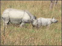 वहाँ एक मादा गैंडा मिली, हमारा हाथी आता देख गैंडे का एक बच्चा घास के बीच से भाग कर अपनी माँ के पास दुबक गया.