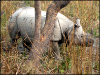 तभी हमारे गाइड नसीम अहमद ने बाई तरफ़ इशारा किया. दूरबीन से देखा तो पता चला वह गैंडा है. हमने जल्दी से एक हाथी का इंतजाम किया और पहुँच गए ऊंची ऊंची घास के उस घने जंगल मे.
