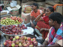 कोलकाता के दक्षिणी हिस्से में एक व्यस्त सड़क के किनारे फुटपाथ पर दुकान लगाकर फल और सब्जियां बेचने वाले लगभग 400 दुकानदारों