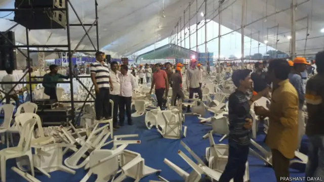 गुजरात में मौजूद स्थानीय पत्रकार प्रशांत दयाल ने प्रत्यक्षदर्शियों के हवाले से बताया, "पंडाल में लगभग 5000 लोग मौजूद थे. अचानक कई लोग खड़े हो गए और हार्दिक पटेल के नाम के नारे लगाने लगे. फिर उन्होंने कुर्सियां उछालनी शुरू कर दी और अपनी नाराज़गी जताई. पुलिस वहां मौजूद थी और उसने उनकी घेराबंदी करके उन्हें बाहर निकाला."