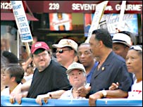 लेकिन वहाँ राष्ट्रपति जॉर्ज डब्ल्यू बुश के विरोध में हज़ारों लोग सड़कों पर निकल आए हैं. ये लोग बुश की विदेश और घरेलू नीति का विरोध कर रहे हैं. विरोध प्रदर्शन का आयोजन करने वालों का दावा है कि इस प्रदर्शन में लगभग पाँच लाख लोगों ने हिस्सा लिया. लेकिन अधिकारियों का कहना है विरोध प्रदर्शन में क़रीब सवा लाख लोग शामिल थे. पुलिस ने क़रीब 200 लोगों को गिरफ़्तार भी किया है. प्रदर्शन को देखते हुए सुरक्षा के कड़े इंतज़ाम किए गए हैं और अधिवेशन स्थल को पूरी तरह घेर लिया गया है. आस-पास के इलाक़े में पुलिस मुस्तैद है और बम निरोधक दस्ते भी सतर्क हैं. इस विरोध प्रदर्शन में प्रसिद्ध फ़िल्म निर्माता माइकल मूर भी शामिल थे. इस प्रदर्शन के दौरान किसी तरह की दुर्घटना या किसी को चोट लगने की ख़बर नहीं मिली है. |