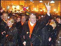 उनके हज़ारों समर्थक छह दिन से कड़ाके की सर्दी के बावजूद कीव के 'इंडीपेंडेंस स्क्वेयर' में रोष प्रदर्शन कर रहे हैं. संकट समाप्त करने के लिए युशचेन्को ने आधिकारिक नतीजे में विजयी घोषित किए गए प्रधानमंत्री विक्टोर यानूकोविच से बातचीत भी की. युशचेन्को ने ये माँग रखी कि देश में नए सिरे से राष्ट्रपति चुनाव यूरोपीय सुरक्षा और सहयोग संगठन ओएससीई की निगरानी में हों. हिंसा के ख़िलाफ़ संसद के स्पीकर व्लादिमीर लितविन ने संसद में मतदान से पहले ही कहा था कि समस्या का सबसे व्यावहारिक हल यही है कि चुनाव को अवैध करार दिया जाए.