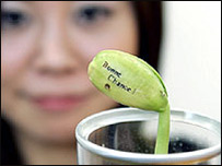 जो लोग अपने प्यार का इज़हार नहीं कर पाते यानि 'आई लव यू' नहीं कह पाते, अब एक ऐसा पौधा ख़रीद पाएँगे जो उनकी भावनाओं को उनके प्रेमी या प्रेमिका तक पहुँचा सके. जापान में खिलौने बनाने वाली दो कंपनियाँ - टॉमी और टाकारा ने एक ऐसा पौधा तैयार किया है जो ऐसे लोगों की मदद कर सकता है. इन कंपनियों एक ऐसा सेमवर्गीय बीज तैयार किया है जो अंकुरित होने पर इस विशेष संदेश को दूसरे व्यक्ति तक पहुँचाता है. टाकारा कंपनी का कहना है कि ये पौधा एक नई तरह का संदेश कार्ड है जो आपकी भावनाएँ दूसरे लोगों तक पहुँचा सकता है. दरअसल ये पौधा छह अलग-अलग तरह के संदेश पहुँचा सकता है जिसमें 'शुभकामनाएँ' और 'मै तुम्हें प्यार करता हूँ' शामिल हैं. ये संदेश इस पौधे पर लेसर से लिखे गए हैं. उधर टॉमी कंपनी एक सफ़ेद अंडा देती है जिसमें ये सेमवर्गीय बीज होता है और पानी में रखने पर ये अंडा फूट जाता है और फिर बीज अंकुरित होता है और नज़र आता है ये संदेश. इसमें संदेश एक तरफ़ फ़्रांसीसी भाषा में और दूसरी ओर जापानी भाषा में लिखा हुआ है. ये दोनो पौधे फ़रवरी से बाज़ार में उपलब्ध होंगे. |