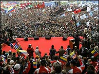 एक फ़ुटबॉल स्टेडिम में शावेज़ का किसी नायक जैसा स्वागत किया गया. उन्होंने कहा, "यहाँ मार डेल प्लाता में अमरीकी मुक्त व्यापार क्षेत्र की योजना दफ़न हो जाएगी." लोगों से एकजुटता का आह्वान करते हुए शावेज़ ने कहा, "एकजुट होकर ही हम सम्राज्यवाद का मुक़ाबला कर सकते हैं और अपने लोगों को बेहतर ज़िंदगी मुहैया करा सकते हैं." उन्होंने कहा कि अमरीकी साम्राज्यवाद वेनेज़ुएला में उनके नेतृत्व में हुई साम्यावादी क्रांति को नहीं रोक सकता. जनसभा में शावेज़ के साथ मंच पर अर्जेंटीना के पूर्व फ़ुटबॉल स्टॉर दिएगो माराडोना भी मौजूद थे. | इससे जुड़ी ख़बरें सम्मेलन के लिए कड़ी सुरक्षा व्यवस्था04 नवंबर, 2005 | पहला पन्ना कास्त्रो मारादोना के मेहमान बने29 अक्तूबर, 2005 | मनोरंजन वेनेज़ुएला में हिंसक प्रदर्शन04 जनवरी, 2003 | पहला पन्ना इंटरनेट लिंक्स बीबीसी बाहरी वेबसाइट की विषय सामग्री के लिए ज़िम्मेदार नहीं है. | |||||||||||||||||||||||||||||||||||||||||||||||||||||||||||||||||||||||||||||||||||||||||||||