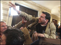 सुरक्षाकर्मियों ने मुंतदार अल ज़ैदी को अपने नियंत्रण में ले लिया. वो मिस्र स्थित चैनल अल बग़दादिया टीवी के लिए काम करते हैं.