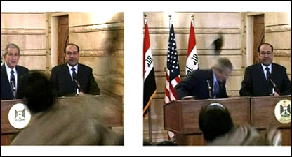 रविवार को अचानक इराक़ पहुँचे राष्ट्रपति बुश पर इस टीवी रिपोर्टर ने उस समय जूते चलाए जब वे इराक़ी प्रधानमंत्री नूरी अल मलिकी के साथ संयुक्त संवाददाता सम्मेलन को संबोधित कर रहे थे.