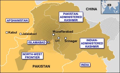 अमरीका ने राहत कार्य के लिए एक करोड़ डॉलर और कुवैत ने 10 करोड़ डॉलर देने की घोषणा की है. संयुक्त राष्ट्र के एक अधिकारी ने कहा है कि पाकिस्तान ने अंतरराष्ट्रीय सहायता में तालमेल के लिए संयुक्त राष्ट्र से केंद्रीय भूमिका निभाने का आग्रह किया है. प्रधानमंत्री प्रभावित क्षेत्रों के लिए पहले ही पाँच अरब रुपए के पैकेज की घोषणा कर चुके हैं. मरने वालों को एक लाख रूपए का मुआवज़ा और घायलों को 50 हज़ार रुपए दिए जाएँगे. पाकिस्तान में इस त्रासदी के बाद तीन दिन के शोक की घोषणा भी की गई है. बालाकोट, मुज़फ़्फ़राबाद, मनशेरा, इस्लामाबाद की स्थिति पाकिस्तान प्रशासित कश्मीर की राजधानी मुज़फ़्फ़राबाद में मौजूद विभिन्न से बीबीसी संवाददाताओं के अनुसार शहर मलबे में तब्दील हो चुका है. वहाँ क्रिकेट स्टेडियम में घायलों और बेघरों को रखा गया है. गंभीर रूप से घायल लोगों को हेलीकॉप्टर से राजधानी इस्लामाबाद पहुँचाया जा रहा है. पाकिस्तान प्रशासित कश्मीर के बाद भूकंप से बुरी तरह प्रभावित होने वाला दूसरा प्रांत है उत्तर पश्चिम सीमा प्रांत या सूबा सरहद. बीबीसी उर्दू के संवाददाता शाहज़ेब जीलानी के अनुसार इस प्रांत के शहर बालाकोट में 90 प्रतिशत इमारतें और मकान गिर गए हैं. उन्होंने वहाँ देखा कि लोग अपने बुरी तरह घायल बच्चों को पीठ पर उठाकर सुरक्षित जगहों पर इलाज के लिए लेजा रहे थे या मलबे से निकाल रहे थे. लोगों में ये गुस्सा था कि सेना उस इलाक़े में तो पहुँच गई है लेकिन उनकी मदद नहीं कर रही. एक इमारत के मलबे के पास खड़े अनेक लोगों ने शिकायत की कि लगभग 300 बच्चे मलबे के नीचे दबे हुए हैं लेकिन किसी तरह की मदद नहीं मिली है. वहीं मनसेरा ज़िले में स्कूलों की इमारत के गिरने से कम से कम 400 बच्चों की मौत हो गई है. पूरे सूबा सरहद में भूकंप के कारण 1800 से ज़्यादा लोगों के मारे जाने की पुष्टि हो चुकी है. हज़ारों अन्य लोग घायल बताए जाते हैं. राजधानी इस्लामाबाद में भूकंप के कारण एक दस मंजिला इमारत गिर गई जिससे अभी तक कम-से-कम 25 लोगों के मारे जाने की ख़बर है.मलबे से 90 घायल लोगों को भी निकाला गया है. नक्शे पर भूकंप प्रभावित इलाक़े:-