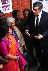 ब्राउन अपनी पत्नी सारा के साथ ऐसी महिलाओं से मिले जो प्रौढ़ शिक्षा से लेकर महिलाओं के प्रति हिंसा जैसे मुद्दों को उठा रही हैं. इस सहायता राशि में से 50 लाख पाउंड स्वास्थ्य और शिक्षा योजनाओं पर खर्च किए जाएंगे. इसके तहत तीन लाख अतिरिक्त शिक्षकों की नियुक्ति, स्कूलों में तीन लाख कमरों का निर्माण और वर्ष 2011 तक 40 लाख और बच्चों को स्कूल भेजने का लक्ष्य शामिल है. उन्होंने महिला समाख्या सम्मेलन की सदस्यों से कहा कि वे उनके कार्यों से प्रभावित हैं. ब्राउन का कहना था, "हम यहाँ मौजूद युवतियों से प्रेरणा ले सकते हैं जो हमें अपने भविष्य की योजनाओं के बारे में बता रही हैं. महिलाएँ भारत को बदल रही हैं और भविष्य में बदलाव के लिए मुख्य भूमिका में हैं." आतंकवाद इससे पहले ब्राउन ने रविवार को यहां पहुंचने के थोड़ी देर बाद संवाददाताओं से कहा कि वह भारत के साथ आतंकवाद के खिलाफ लड़ाई में अधिक द्विपक्षीय सहयोग के साथ बंदरगाहों और हवाई अड्डों पर सुरक्षा समन्वय पर ध्यान केंद्रित करने पर बल देंगे.