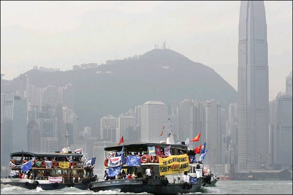हाँगकाँग में तस्वीर में पीछे दिख रहे कॉन्फ़्रेन्स सेंटर में 13 दिसंबर 2005 से विश्व व्यापार संगठन की वार्ता आरंभ हुई. व्यापार नीतियों का बड़े पैमाने पर विरोध हो रहा है. पानी में नावों में बैठे लोग प्रदर्शनकारी हैं. |