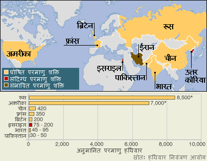 ![]() 6 अगस्त 1945 को एटम बम की अकल्पित शक्ति के मालूम पड़ने के बाद से तो दुनिया में एक तरह से परमाणु हथियारों की होड़ लग गई. शुरूआत अमरीका ने की जिसके बाद कम-से-कम छह अन्य देशों ने खुले तौर पर परमाणु परीक्षण कर स्वयं को महाशक्तियों की पंक्ति में ला खड़ा किया. इसराइल इस बात से इनकार करता है कि उसके पास परमाणु हथियार हैं. उत्तर कोरिया दावा करता है कि उसके पास परमाणु हथियार हैं लेकिन इसका कोई ब्यौरा नहीं है. वहीं ईरान पर ये आरोप लगता रहा है कि वह चोरी-छुपे परमाणु हथियार बना रहा है. |