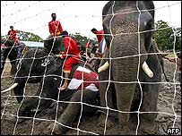 पूरी दुनिया में इस समय विश्व कप फ़ुटबॉल के बाद सबसे प्रतिष्ठित प्रतियोगिता यूरो 2004 का बुख़ार चल रहा है और स्टार खिलाड़ियों के प्रति लोगों का जुनून देखते ही बन रहा है. लेकिन पुर्तगाल में चल रहे यूरो कप से कोसों दूर थाईलैंड में रविवार को एक विशेष फ़ुटबॉल मैच का आयोजन हुआ जिसके स्टार रहे हाथी. दरअसल देश में यूरो कप को लेकर चल रही ग़ैर क़ानूनी सट्टेबाज़ी से परेशान थाई अधिकारियों ने लोगों को यह दिखाने के लिए इस विशेष मैच का आयोजन किया कि सट्टेबाज़ी से ज़्यादा महत्वपूर्ण है फ़ुटबॉल मैच का आनंद. और अपना संदेश देने के लिए उन्होंने चुना दस हाथियों की एक टीम को जिनके सामने थी थाई जेल की एक टीम. थाईलैंड की जेल में बंद क़ैदी यूरो कप को लेकर सबसे ज़्यादा सट्टेबाज़ी में शामिल पाए गए हैं. कीचड़ वाले मैदान पर खेले गए इस ख़ास मैच में शुरुआती गोल तो थाईलैंड के क़ैदियों ने मारा लेकिन जल्द ही इस मैच के लिए तैयार की गई विशेष गेंद पर हाथियों ने अपना नियंत्रण बना लिया. फिर क्या था ज़बरदस्त ज़ोर-आज़माइश हुई. कीचड़ में उठा-पटक का ये आलम था कि कई बार स्कोर को लेकर संशय की स्थिति बनी. अस्पष्ट नतीजे आख़िरी नतीजे भी स्पष्ट नहीं थे. एक पक्ष यह था कि मैच 5-5 से बराबर रहा लेकिन दूसरा पक्ष यह था कि हाथियों ने यह मैच 7-6 से जीत लिया है.