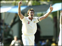 उनका अच्छा साथ निभाया मलिंगा ने. उन्होंने दो विकेट लिए. ऑस्ट्रेलिया की ओर से सबसे ज़्यादा रन बनाए डेरेन लीमैन. उन्होंने 57 रन बनाए और चौथे विकेट के लिए डेमियन मार्टिन के साथ मिलकर महत्वपूर्ण 97 रन जोड़े. मार्टिन 47 रन बनाकर आउट हुए. सलामी बल्लेबाज़ हेडन ने 37 और लैंगर ने 30 रन बनाए. जवाब में श्रीलंका की शुरुआत भी काफ़ी ख़राब रही और एक समय उसके तीन विकेट सिर्फ़ 33 रन पर गिर गए थे. अटापट्टू चार, जयसूर्या आठ और संगकारा दो रन बनाकर आउट हुए. खेल ख़त्म होने के समय श्रीलंका का स्कोर था तीन विकेट पर 43 रन. क्रीज़ पर थे जयवर्धने 12 रन बनाकर और नाइट वाचमैन जोयसा आठ रन बनाकर. लंबे समय बाद मैदान पर उतरे मैकग्रा ने दो और गिलेस्पी ने एक विकेट लिए. |