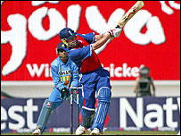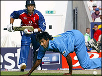 हरभजन ने 10 ओवरों में मात्र 14 रन ख़र्च किए. लेकिन कोई अन्य भारतीय गेंदबाज़ रनों पर नियंत्रण नहीं रख पाए. इंग्लैंड का चौथा विकेट 105 रन के स्कोर पर ही गिर चुका था. लेकिन पाँचवें विकेट के लिए फ़्लिंटॉफ़ और कॉलिनवुड ने 174 रन जोड़े. अंतत: अगरकर ने फ़्लिंटॉफ़ को द्रविड़ के हाथों कैच कराया, जब वह शतक से मात्र एक रन दूर थे. शुक्रवार को ओवल के मैदान पर भारत ने टॉस जीतकर पहले क्षेत्ररक्षण करने का फ़ैसला किया. इंग्लैंड ने अच्छी शुरुआत की लेकिन फिर भारतीय स्पिनरों के दवाब में उसके विकेट गिरने लगे. पहला विकेट 71 रन के स्कोर पर गिरा जब मार्क्स ट्रेस्कोथिक को हरभजन सिंह की गेंद पर बालाजी ने कैच आउट किया. उन्होंने 27 रन बनाए. इसके बाद कप्तान माइकल वॉन का विकेट भी हरभजन ने ही लिया जब उनका कैच द्रविड़ ने लपका. वे केवल चार रन बना पाए. तीसरा विकेट स्ट्रॉस का गिरा जिन्होंने दो रन बनाए और सहवाग की गेंद पर गांगुली ने उनका कैच पकड़ा. विक्रम सोलंकी 48 रन बनाकर सहवाग की गेंद पर आउट हुए. नैटवेस्ट क्रिकेट श्रृंखला के पहले एक दिवसीय मैच में इंग्लैंड भारत को सात विकेट से हरा चुका है. |