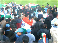 न भारतीय दर्शक सीमा तोड़ रहे थे और न पाकिस्तान दर्शक बेक़ाबू हो रहे थे. भारतीय दर्शकों की संख्या ज़्यादा थी लेकिन वे पाकिस्तानी दर्शकों के साथ ऐसे घुले-मिले थे कि लग ही नहीं रहा था कि कौन किसके आउट होने पर ख़ुश हो रहा है और कौन दुखी. इन्हीं में एक पाकिस्तान समर्थक ख़ादिम अपनी लगातार नारेबाज़ी से सबका ध्यान आकर्षित कर रहे थे. जब मैंने उनसे बात की तो उनका कहना था कि भारतीय समर्थकों के साथ वे मैच का आनंद ले रहे हैं. ख़ादिम ने कहा, "कभी हम उन्हें स्कोर बोर्ड दिखा रहे हैं तो कभी वे तालियाँ पीट-पीट कर हमारी आवाज़ दबाने की कोशिश कर रहे हैं. लेकिन आप देख सकते हैं हम मिल-जुल कर मैच का आनंद ले रहे हैं. कोई तनाव नहीं. मौक़ा है सिर्फ़ एक अच्छे मैच का मज़ा लेने का." ऐसी थी भावना ख़ादिम की तरह की भावना दूसरे दर्शकों की भी थी. विनती अपनी दो बेटियों के साथ मैच देखने आईं थी वो भी क़रीब आठ हज़ार रुपए में ब्लैक टिकट लेकर.
