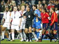 अपने क्लब रियाल मैड्रिड के मैदान पर खेल रहे इंग्लैंड के कप्तान डेविड बेकम को कई बार दोनों देशों के खिलाड़ियों के बीच हुई झड़प में बीच-बचाव करना पड़ा.