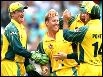 लेकिन इसके बाद भी टीम की स्थिति में कोई सुधार नहीं आया. शोएब मलिक को सिर्फ़ आठ रन के निजी स्कोर पर मैकग्रा ने बोल्ड कर दिया. कप्तान इंज़माम-उल-हक़ एक छोर पर ज़रूर टिके रहे लेकिन दूसरे छोर से लगातार विकेट गिरते रहे. कप्तान इंज़माम 50 रन बनाकर आउट हुए और टीम का स्कोर हो गया सात विकेट पर 103 रन. बाद में एक बार फिर शाहिद अफ़रीदी ने अपने बल्ले का कमाल दिखाया और सिर्फ़ 37 गेंदों पर तीन चौके और तीन छक्कों की मदद से 48 रन बनाए. फिर भी पाकिस्तान की टीम 39.2 ओवर में 163 रन बनाकर आउट हो गई. ऑस्ट्रेलिया की ओर से डेरेन लीमैन ने तीन विकेट लिए जबकि मैकग्रा और ब्रेट ली ने दो-दो विकेट चटकाए. कैस्परोविच और वॉटसन को एक-एक विकेट मिला. |