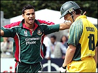 बांग्लादेश ने विश्व चैंपियन ऑस्ट्रेलिया को एकदिवसीय मैच में हराकर क्रिकेट की दुनिया में तहलका मचा दिया है. ब्रिटेन के कार्डिफ़ में नैटवेस्ट सिरीज़ के एक मैच में सबसे कमज़ोर टीमों में गिनी जानेवाली बांग्लादेश की टीम ने ऑस्ट्रेलिया को पाँच विकेट से हरा दिया. यह जीत उसने शानदार ढंग से हासिल की. अंतिम ओवर में बांग्लादेश को सात रन बनाने थे, और आफ़ताब अहमद ने ओवर की शुरूआत ही एक बड़े छक्के से की. ऑस्ट्रेलियाई कप्तान रिकी पोंटिंग ने इसे क्रिकेट इतिहास के सबसे बड़े उलटफेरों में से एक बताया है. इससे पहले छह बार दोनों टीमें भिड़ी थीं और बांग्लादेश की टीम को छहों बार हार का मुँह देखना पड़ा था. बांग्लादेश की पारी सोफ़िया गार्डेन्स मैदान पर शनिवार को ऑस्ट्रेलिया ने टॉस जीतकर पहले बल्लेबाज़ी करने का फ़ैसला किया और निर्धारित 50 ओवरों में पाँच विकेट पर 249 रन बनाए. बांग्लादेश ने 49.2 ओवर में पाँच विकेट खोकर जीत के लिए ज़रूरी 250 रन बना लिए. जीत में मुख्य योगदान युवा बल्लेबाज़ मोहम्मद अशरफ़ुल के शतक का रहा. वे 101 गेंद पर ठीक 100 रन बनाकर आउट हुए. एकदिवसीय अंतरराष्ट्रीय क्रिकेट में शतक ठोंकने वाले वह मात्र दूसरे बांग्लादेशी खिलाड़ी हैं. अशरफ़ुल के आउट होने पर एक बार तो लगा कि ऑस्ट्रेलिया की झोली में मैच चला गया क्योंकि तब बांग्लादेश को जीत के लिए ज़रूरी 23 रन मात्र 17 गेंदों पर बनाने थे. लेकिन ऐसे में आफ़ताब अहमद और मोहम्मद रफ़ीक़ ने सावधानी से खेलते हुए टीम को ऐतिहासिक जीत दिला दी. आफ़ताब 9 और रफ़ीक़ 22 रन बनाकर नाबाद रहे. ऑस्ट्रेलियाई गेंदबाज़ों में गिलेस्पी दो विकेट लेकर सबसे सफल रहे. ऑस्ट्रेलियाई पारी