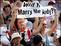 विंबलडन में पहले हफ़्ते में ब्रिटेन के टिम हेनमैन और ग्रेग रुज़ेस्की के बाहर होने के बाद इस बार बात हो रही है स्कॉटलैंड के 18 वर्षीय खिलाड़ी एंडी मरे की. विंबलडन की एक ख़ासियत है कि जब खिलाड़ी खेलने से पहले और खेलने के बाद जाते हैं तो वो आसपास खड़े दर्शकों के इतने करीब से गुज़रते हैं कि आप उन्हें छू सकते हैं. तो यही कोशिश रहती है कुछ युवतियों की कि वो एंड्रयू मरे को छू सकें. कुछ तो वहीं खड़े होकर पूछती हैं, “एंड्रयू, मुझसे शादी करोगे?” ******************************************************************* जोड़ीदार की तलाश में परेशान इस विंबलडन में महेश भूपति का खेल देखने पहुँचे हैं उनके ससुर टीएस जयशंकर जो एक उद्योगपति हैं और उनकी सास से जो पेशे से डॉक्टर हैं. महेश भूपति के ससुर टीएस जयशंकर ने माना कि हाल ही में महेश कुछ परेशान थे क्योंकि उनकी डबल्स जोड़ीदार लीज़ा रेमंड ने दूसरे खिलाड़ियों के साथ खेलने के लिए बात शुरू कर दी थी लेकिन अब महेश ख़ुश हैं कि मेरी पियर्स उनकी जोड़ीदार हैं. जयशंकर ने बताया, "महेश के लिए भी ये एक आश्चर्य की बात थी कि लीज़ा रेमंड ने उन्हें बताए बिना दूसरे खिलाड़ियों के साथ खेलने की बात शुरू कर दी, तो सेफ़्टी के तौर पर महेश ने मेरी पियर्स से बात कर ये फ़ैसला किया कि वो अब उनके साथ खेलेंगे." ******************************************************************* वाह-वाह गर्मी भारत से आए दर्शकों को ब्रिटेन की गर्मी भा रही थी. एक टेनिस प्रेमी हँस रहे थे कि स्थानीय अख़बार 'ईवनिंग स्टैंडर्ड' में ख़बर है कि भीषण गर्मी दस दिन तक जारी रहेगी. उनका कहना था कि इन दस दिनों में अधिकतम तापमान 31 डिग्री सेल्सियस था और आम तौर पर तापमान 26 से 31 तक ही था – अगर ये लोग भारत आए तो इनका क्या हाल होगा! ******************************************************************* नाम बड़ा और दर्शन खोटे