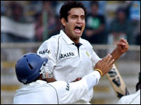 कराची टेस्ट मैच में भारत के लिए गेंदबाज़ी के हिसाब से तो पहला दिन बेहतरीन रहा लेकिन बल्लेबाज़ी में भारतीय पारी थोड़ी लड़खड़ाई हुई नज़र आ रही है. दिन का खेल ख़त्म होते समय भारत मात्र 74 रन के स्कोर पर अपने चार कीमती विकेट खो चुका था. भारत की ओर से कप्तान राहुल द्रविड़ और वीवीएस लक्ष्मण बल्लेबाज़ी करने उतरे लेकिन चौथे ही ओवर में भारत को पहला झटका लगा. राहुल द्रविड़ मात्र तीन रन के स्कोर पर मोहम्मद आसिफ़ की गेंद पर अकमल के हाथों कैच आउट हुए. राहुल द्रविड़ के जाने के बाद मैदान पर आए वीरेंदर सहवाग. पहले टेस्ट मैच में आतिशी पारी खेल चुके सहवाग से भारत को ख़ासी उम्मीद थी लेकिन वे भी पाँच रन बनाकर जल्द ही राहुल द्रविड़ के पीछे पीछे पैविलियन लौट गए. लक्ष्मण भी 19 रन बनाकर मोहम्मद आसिफ़ की गेंद का शिकार हुए. सचिन तेंदुलकर ने कुछ बेहतरीन शॉट लगाए तो भारतीय खेमे में उम्मीद बंधी. लेकिन वो भी 23 रन बनाकर रज़्ज़ाक की गेंद पर आउट हो गए. खेल ख़त्म होते समय युवराज सिंह और सौरभ गांगुली खेल रहे थे. पाकिस्तानी पारी इससे पहले अपनी पारी में पाकिस्तान की पूरी टीम 245 रन बनाकर आउट हो गई. पाकिस्तान की ओर से सबसे ज़्यादा रन कामरान अकमल ने बनाए. वे 113 बनाकर आउट हुए. भारत ने टॉस जीतने के बाद पाकिस्तान को पहले बल्लेबाज़ी के लिए बुलाया. जब मैच शुरु हुआ तो शायद किसी ने भी नहीं सोचा होगा कि भारतीय गेंदबाज़ी की शुरुआत इतनी धमाकेधार रहेगी. मैच में पाकिस्तान का खाता खुला भी नहीं था कि पहले ही ओवर में भारतीय गेंदबाज़ इरफ़ान पठान ने हैट्रिक लगाया और तीन पाकिस्तानी बल्लेबाज़ चलते बने. शतक
