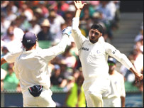 कप्तान रिकी पोंटिंग फिर सस्ते में सिर्फ़ तीन रन बना कर हरभजन के शिकार हुए. छह रनों के अंतराल पर दो विकेट चटकाने के बाद हरभजन ने कुछ उम्मीद जगाई. इसके बाद फिल जैक्स को कुंबले ने अपनी ही गेंद पर लपका. उन्होंने 51 रन बनाए. माइक हसी 36 रन बनाकर आरपी सिंह का शिकार बने. लेकिन एंड्र्यू साइमंड्स और माइकल क्लार्क ने भारतीय मंसूबों पर पानी फेरते हुए 82 रनों की साझीदारी कर दी. साइमंड्स को ज़हीर ख़ान ने 44 रनों के निजी स्कोर पर चलता किया. कठिन चुनौती इसके बाद माइकल क्लार्क 73 रनों की शानदार पारी खेल कर स्टंप आउट हो गए. मेज़बानों का सातवाँ विकेट एडम गिलक्रिस्ट के रुप में गिरा जिन्हें हरभजन सिंह ने आउट किया.