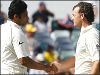उस समय साइमंड्स के साथ बैटिंग कर रहे एडम गिलक्रिस्ट ने भी भारतीय कप्तान से हाथ मिलाकर उन्हें बधाई दी. कुंबले के ऊपर श्रीलंका के ऑफ स्पिनर मुथैया मुरलीधरन और ऑस्ट्रेलिया के शेन वॉर्न का स्थान आता है. सबसे ज़्यादा विकेटों का रिकॉर्ड मुरली के नाम है जिन्होंने 723 टेस्ट विकेट अपने खाते में दर्ज कराए हैं. शेन वॉर्न के नाम 708 विकेट हैं. फ़र्क ये है कि वॉर्न जहाँ संन्यास ले चुके हैं, वहीं मुरली और कुंबले अभी भी अपना जलवा दिखा रहे हैं. |